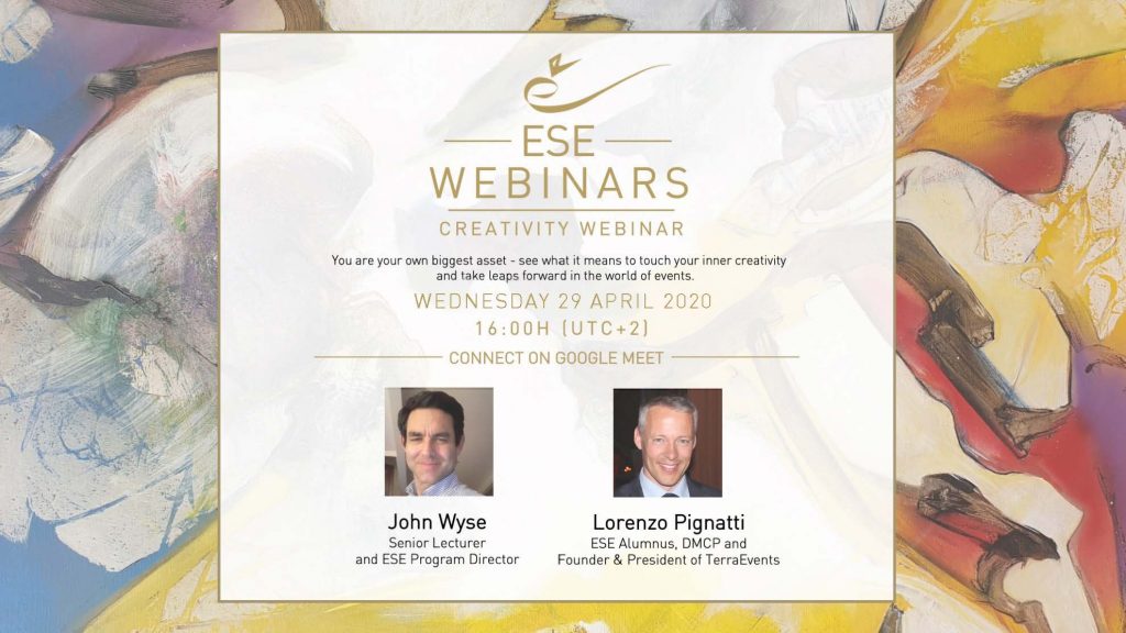 John Wyse, Senior Lecturer in Strategy, Innovation and Entrepreneurship and ESE Program Director, terrà il nostro Creativity Webinar insieme al suo ospite speciale Lorenzo Pignatti, ESE Alumnus, DMCP and Founder & President of TerraEvents.